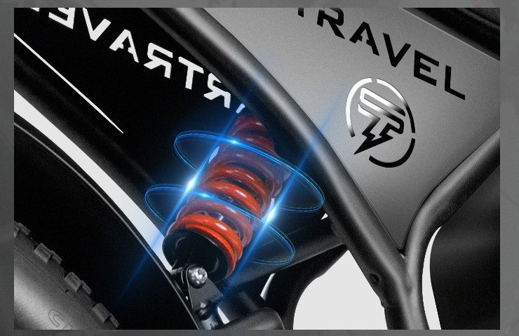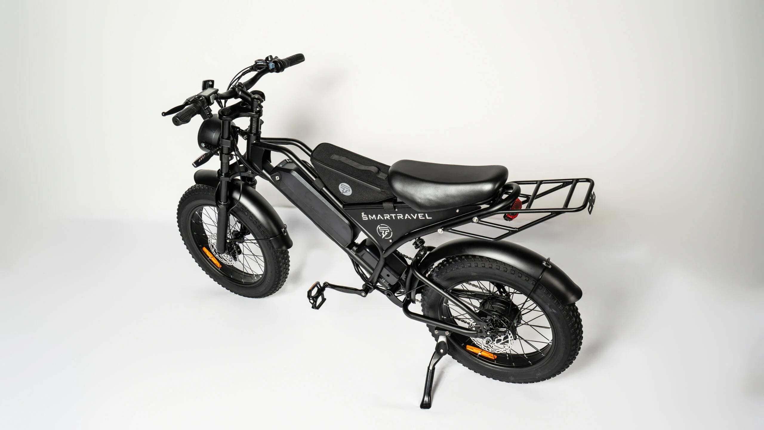 The Smartravel bike features advanced battery technology with a 48V 18.2AH battery (873.6Wh), offering enhanced range, stability, and safety. It covers up to 26+ miles in electric mode and 45+ miles in PAS mode. The BMS ensures smart protection, maintaining 80% capacity even after 800 charges, ensuring durability and efficiency.